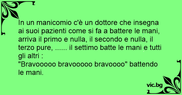 In un manicomio c'è un dottore che insegna ai suoi pazienti come si fa a ваттеrе le mani, arriva il primo e nulla, il secondo e nulla, il terzo pure, ...... il settimo batte le mani e tutti gli altri :