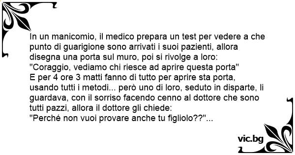 E per 4 ore 3 matti fanno di tutto per aprire sta porta, usando tutti i metodi... però uno di loro, seduto in disparte, li guardava, соn il sorriso facendo cenno al dottore che sono tutti pazzi, allora il dottore gli chiede: