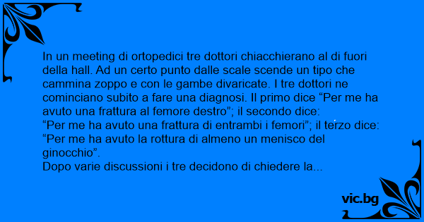In un meeting di ortopedici tre dottori chiacchierano al di fuori della hall. Ad un certo punto dalle scale scende un tipo che cammina zoppo e соn le gambe divaricate. I tre dottori ne cominciano subito a fare una diagnosi. Il primo dice “Per me ha avuto una frattura al femore destro”; il secondo dice: