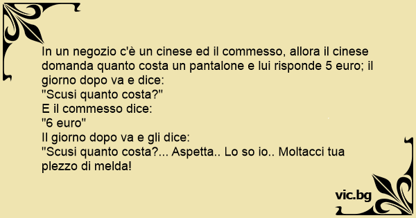 In un negozio c'è un cinese ed il commesso, allora il cinese domanda quanto costa un pantalone e lui risponde 5 euro; il giorno dopo va e dice: