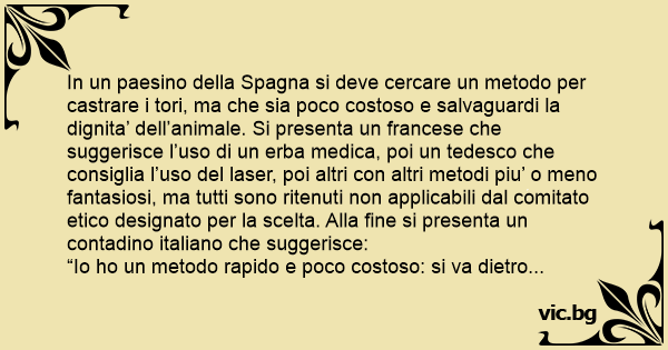 In un paesino della Spagna si deve cercare un metodo per castrare i tori, ma che sia poco costoso e salvaguardi la dignita’ dell’animale. Si presenta un francese che suggerisce l’uso di un erba medica, poi un tedesco che consiglia l’uso del laser, poi altri соn altri metodi piu’ o meno fantasiosi, ma tutti sono ritenuti non applicabili dal comitato etico designato per la scelta. Alla fine si presenta un contadino italiano che suggerisce: