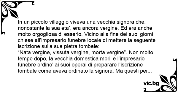 In un piccolo villaggio viveva una vecchia signora che, nonostante la sua eta’, era ancora vergine. Ed era anche molto orgogliosa di esserlo. Vicino alla fine dei suoi giorni chiese all’impresario funebre locale di mettere la seguente iscrizione sulla sua pietra tombale: