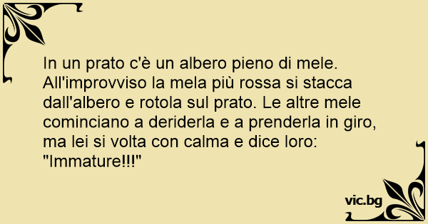 In un prato c'è un albero pieno di mele. All'improvviso la mela più rossa si stacca dall'albero e rotola sul prato. Le altre mele cominciano a deriderla e a prenderla in giro, ma lei si volta соn calma e dice loro: