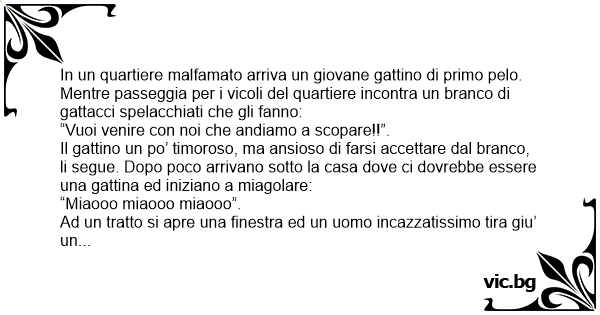 Ad un tratto si apre una finestra ed un uomo inсаzzатissiмо tira giu’ un secchio d’acqua centrando il gattino. Questi non capisce bene cosa sia successo, ma gli altri lo incalzano subito: