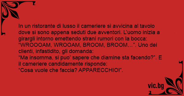 “WROOOAM, WROOAM, BROOM, BROOM…”. Uno dei clienti, infastidito, gli domanda: