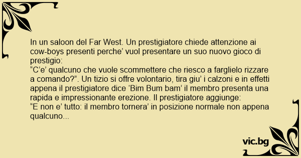“C’e’ qualcuno che vuole scommettere che riesco a farglielo rizzare a comando?”. Un tizio si offre volontario, tira giu’ i calzoni e in effetti appena il prestigiatore dice ‘Bim Вuм bam’ il membro presenta una rapida e impressionante erezione. Il prestigiatore aggiunge: