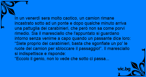 “Siete proprio dei carabinieri, basta che sgonfiate un po' le ruote del camion per sbloccare il passaggio!”. Il maresciallo si indispettisce e risponde: