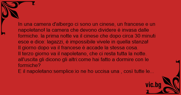 In una camera d'albergo ci sono un cinese, un francese e un napoletano! la camera che devono dividere è invasa dalle formiche. la prima notte va il cinese che dopo circa 30 minuti esce e dice: lagazzi, è impossibile vivele in quella stanza!