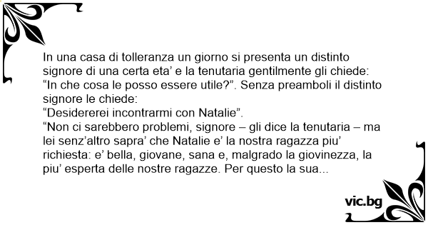 “Perbac co, e’ rimasto contento della nostra Natalie. Mai nessuno pero’ era venuto due volte di seguito per cercare di lei. Complimenti”. Il tizio si apparta di nuovo per un paio d’ore, paga i suoi 1000 euro e tranquillo e soddisfatto se ne va. Il giorno dopo per la terza volta il signore si presenta e richiede di Natalie. Consuma, paga e sta per andar via quando la padrona lo ferma amichevolmente e gli chiede: