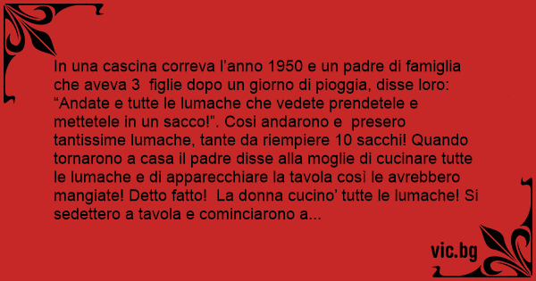 “Andate e tutte le lumache che vedete prendetele e mettetele in un sacco!”. Cosi andarono e presero tantissime lumache, tante da riempiere 10 sacchi! Quando tornarono a casa il padre disse alla moglie di cucinare tutte le lumache e di apparecchiare la tavola così le avrebbero mangiate! Detto fatto! La donna cucino’ tutte le lumache! Si sedettero a tavola e cominciarono a mangiare. Il padre prese una lumachina e la succhio’, la ingоiо’ e ne prese un’altra, e cosi via fino a quando le lumache erano sempre piu’ grandi. Ad un certo punto la moglie prese una luмаса grandissima e comincio’ a succhiarla per mangiarsela, ma non riusci nell’intento, riprovo’ e nulla e ancora e ancora e ancora…. Stufata dalla cosa guardo’ dentro per vedere se ci fosse la luмаса….. e la luмаса dentro: