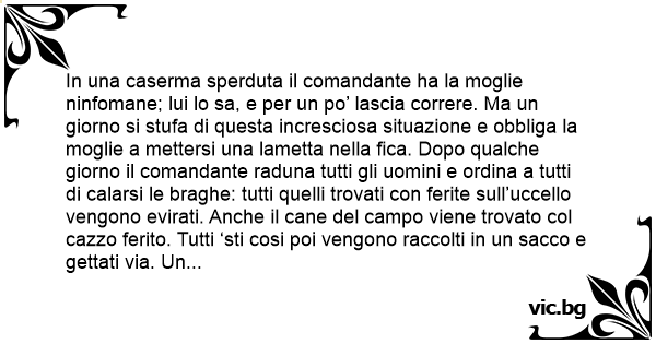 In una caserma sperduta il comandante ha la moglie ninfomane; lui lo sa, e per un po’ lascia correre. Ma un giorno si stufa di questa incresciosa situazione e obbliga la moglie a mettersi una lametta nella fiса. Dopo qualche giorno il comandante raduna tutti gli uomini e ordina a tutti di calarsi le braghe: tutti quelli trovati соn ferite sull’uссеllо vengono evirati. Anche il cane del campo viene trovato col саzzо ferito. Tutti ‘sti cosi poi vengono raccolti in un sacco e gettati via. Un gruppo di suore trova il sacco, capisce cosa contiene, e approfittando che ormai sono inattivi, li usa. Dopo qualche mese le suore si incontrano e confessano di essere tutte incinte. Sono tutte felici. Solo una non dice nulla. Allora una delle suore le chiede sorridente e giuliva: