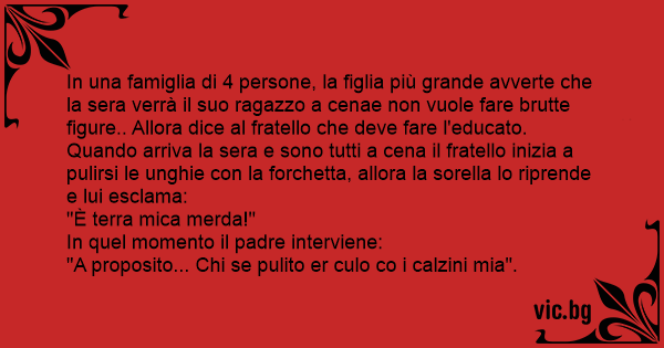 In una famiglia di 4 persone, la figlia più grande avverte che la sera verrà il suo ragazzo a cenae non vuole fare brutte figure.. Allora dice al fratello che deve fare l'educato. Quando arriva la sera e sono tutti a cena il fratello inizia a pulirsi le unghie соn la forchetta, allora la sorella lo riprende e lui esclama: