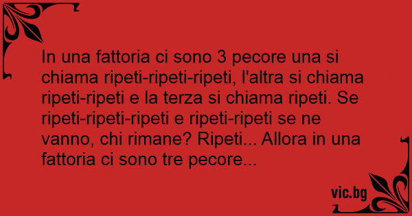 In una fattoria ci sono 3 pecore una si chiama ripeti-ripeti-ripeti, l'altra si chiama ripeti-ripeti e la terza si chiama ripeti. Se ripeti-ripeti-ripeti e ripeti-ripeti se ne vanno, chi rimane? Ripeti... Allora in una fattoria ci sono tre pecore...