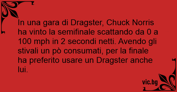 In una gara di Dragster, Chuck Norris ha vinto la semifinale scattando da 0 a 100 mph in 2 secondi netti. Avendo gli stivali un pò consumati, per la finale ha preferito usare un Dragster anche lui.