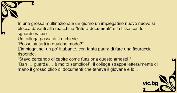 “Bah … guarda … è molto semplice!”: il collega strappa letteralmente di mano il grosso plico di documenti che teneva il giovane e lo posiziona davanti alla bocca del macchinario che, avidamente, li inghiotte, li mastica e li digerisce nel più totale silenzio.