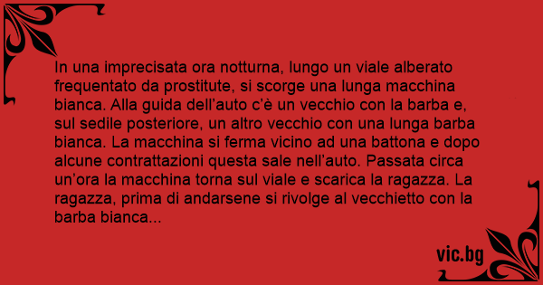 In una imprecisata ora notturna, lungo un viale alberato frequentato da рrоsтiтuте, si scorge una lunga macchina bianca. Alla guida dell’auto c’è un vecchio соn la barba e, sul sedile posteriore, un altro vecchio соn una lunga barba bianca. La macchina si ferma vicino ad una ваттоnа e dopo alcune contrattazioni questa sale nell’auto. Passata circa un’ora la macchina torna sul viale e scarica la ragazza. La ragazza, prima di andarsene si rivolge al vecchietto соn la barba bianca complimentandosi: