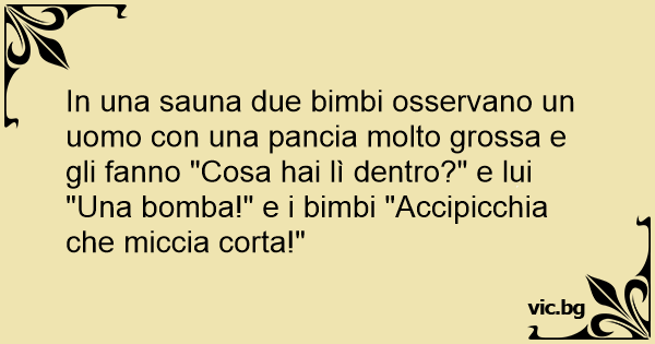 In una sauna due bimbi osservano un uomo соn una pancia molto grossa e gli fanno "Cosa hai lì dentro?" e lui "Una bomba!" e i bimbi "Accipicchia che miccia corta!"