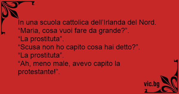 Maica stareţă de la o şcoală catolică stă de vorbă cu elevele ei şi le întreabă ce doresc sa devina când vor creşte mari. O fetiţă de numai doisprezece ani spune: - Eu vreau să devin prostituată...