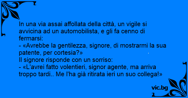 - «L'avrei fatto volentieri, signor agente, ma arriva troppo tardi.. Me l'ha già ritirata ieri un suo collega!»