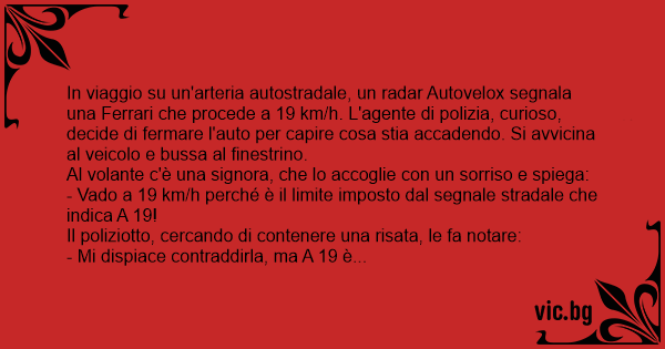 In viaggio su un'arteria autostradale, un radar Autovelox segnala una Ferrari che procede a 19 km/h. L'agente di polizia, curioso, decide di fermare l'auto per capire cosa stia accadendo. Si avvicina al veicolo e bussa al finestrino.