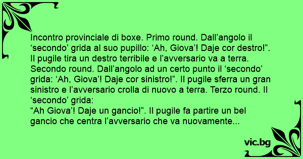Incontro provinciale di boxe. Primo round. Dall’angolo il ‘secondo’ grida al suo pupillo: ‘Ah, Giova’! Daje cor destro!”. Il pugile tira un destro terribile e l’avversario va a terra. Secondo round. Dall’angolo ad un certo punto il ‘secondo’ grida: ‘Ah, Giova’! Daje cor sinistro!”. Il pugile sferra un gran sinistro e l’avversario crolla di nuovo a terra. Terzo round. Il ‘secondo’ grida: