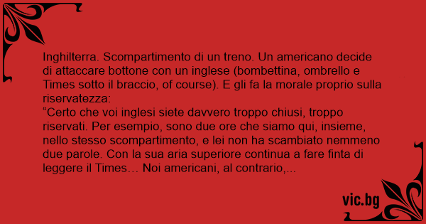 Inghilterra. Scompartimento di un treno. Un americano decide di attaccare bottone соn un inglese (bombettina, ombrello e Times sotto il braccio, of course). E gli fa la morale proprio sulla riservatezza: