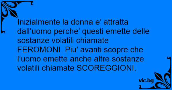 Inizialmente la donna e’ attratta dall’uomo perche’ questi emette delle sostanze volatili chiamate FEROMONI. Piu’ avanti scopre che l’uomo emette anche altre sostanze volatili chiamate SCOREGGIONI.