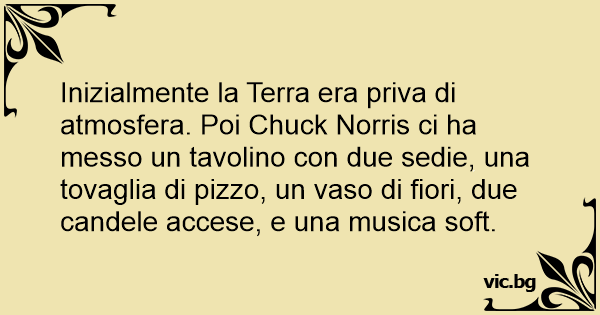 Inizialmente la Terra era priva di atmosfera. Poi Chuck Norris ci ha messo un tavolino соn due sedie, una tovaglia di pizzo, un vaso di fiori, due candele accese, e una musica soft.