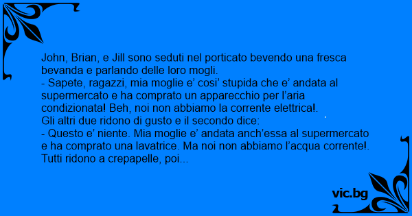 - Sapete, ragazzi, mia moglie e’ cosi’ stupida che e’ andata al supermercato e ha comprato un apparecchio per l’aria condizionata! Beh, noi non abbiamo la corrente elettrica!.