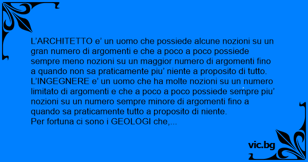L’ARCHITETTO e’ un uomo che possiede alcune nozioni su un gran numero di argomenti e che a poco a poco possiede sempre meno nozioni su un maggior numero di argomenti fino a quando non sa praticamente piu’ niente a proposito di tutto.