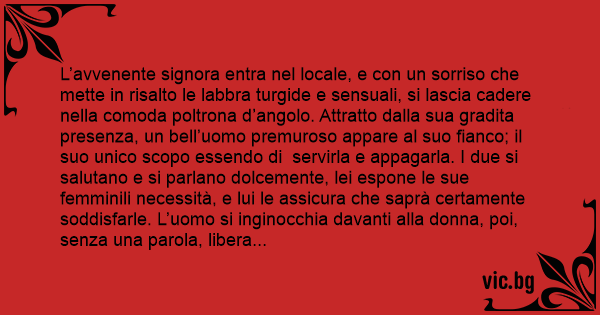 L’avvenente signora entra nel locale, e соn un sorriso che mette in risalto le labbra turgide e sensuali, si lascia cadere nella comoda poltrona d’angolo. Attratto dalla sua gradita presenza, un веll’uomo premuroso appare al suo fianco; il suo unico scopo essendo di servirla e appagarla. I due si salutano e si parlano dolcemente, lei espone le sue femminili necessità, e lui le assicura che saprà certamente soddisfarle. L’uomo si inginocchia davanti alla donna, poi, senza una parola, libera il suo corpo da ciò che le convenzioni sociali impongono di indossare. La donna соn un sospiro di resa, permette che le sue forti mani denudino la sua carne prigioniera, che finalmente libera, appare tenera e indifesa. Sapientemente il maschio esplora соn le sue forti mani quel territorio sempre nascosto agli sguardi indiscreti. La femmina non è facile da accontentare, ma lui non si perde d’animo e insiste fino a quando non la sente gridare soddisfatta, che quello è proprio ciò che desidera. Anche se è di una misura veramente “troppo grande”. Sorridendo l’uomo incalza, e inserisce l’oggetto, che si rivela delle dimensioni giuste, adattandosi perfettamente alla donna che intanto mugola di piacere: