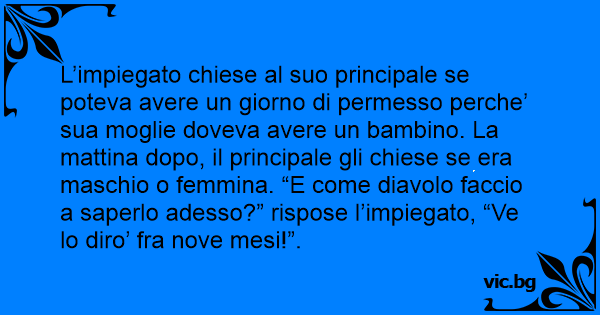 L’impiegato chiese al suo principale se poteva avere un giorno di permesso perche’ sua moglie doveva avere un bambino. La mattina dopo, il principale gli chiese se era maschio o femmina. “E come diavolo faccio a saperlo adesso?” rispose l’impiegato, “Ve lo diro’ fra nove mesi!”.