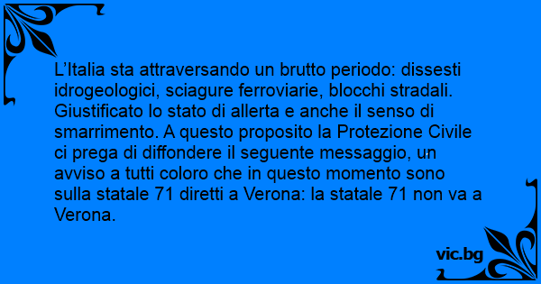 L’Italia sta attraversando un brutto periodo: dissesti idrogeologici, sciagure ferroviarie, blocchi stradali. Giustificato lo stato di allerta e anche il senso di smarrimento. A questo proposito la Protezione Civile ci prega di diffondere il seguente messaggio, un avviso a tutti coloro che in questo momento sono sulla statale 71 diretti a Verona: la statale 71 non va a Verona.