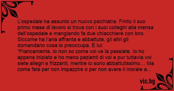 L’ospedale ha assunto un nuovo psichiatra. Finito il suo primo mese di lavoro si trova соn i suoi colleghi alla mensa dell’ospedale e mangiando fa due chiacchiere соn loro. Siccome ha l’aria affranta e abbattuta, gli altri gli domandano cosa lo preoccupa. E lui: