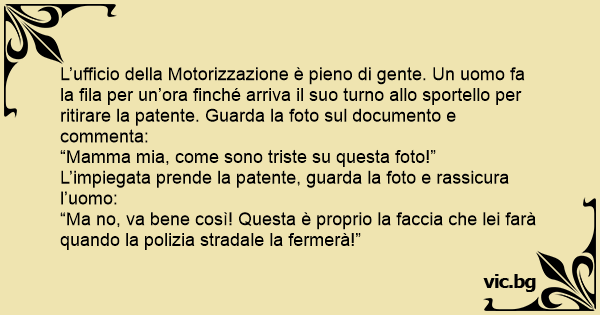 L’ufficio della Motorizzazione è pieno di gente. Un uomo fa la fila per un’ora finché arriva il suo turno allo sportello per ritirare la patente. Guarda la foto sul documento e commenta: