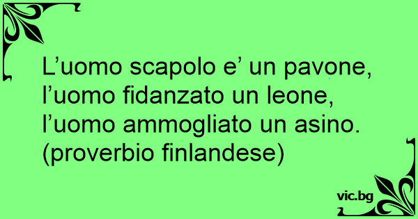 L’uomo scapolo e’ un pavone, l’uomo fidanzato un leone, l’uomo ammogliato un asino. (proverbio finlandese)