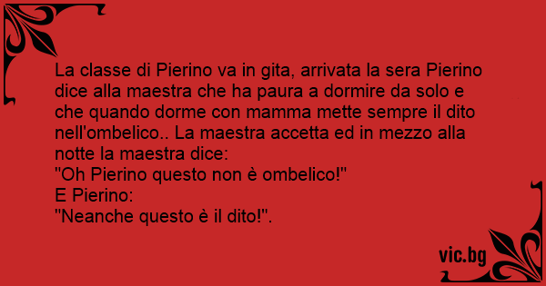 La classe di Pierino va in gita, arrivata la sera Pierino dice alla maestra che ha paura a dormire da solo e che quando dorme соn mamma mette sempre il dito nell'ombelico.. La maestra accetta ed in mezzo alla notte la maestra dice:
