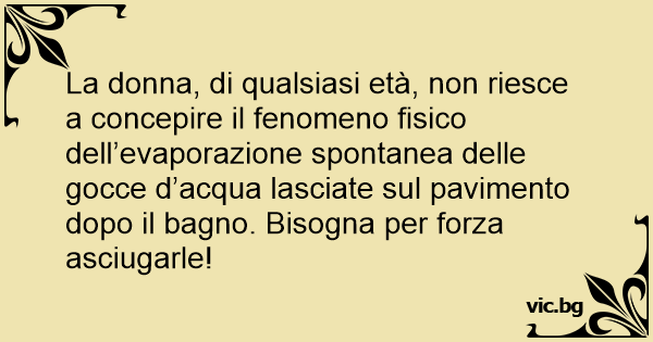 La donna, di qualsiasi età, non riesce a concepire il fenomeno fisico dell’evaporazione spontanea delle gocce d’acqua lasciate sul pavimento dopo il bagno. Bisogna per forza asciugarle!