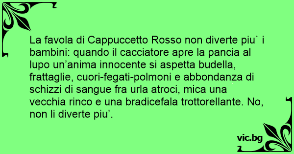 La favola di Cappuccetto Rosso non diverte piu` i bambini: quando il cacciatore apre la pancia al lupo un’anima innocente si aspetta budella, frattaglie, cuori-fegati-polmoni e abbondanza di schizzi di sangue fra urla atroci, mica una vecchia rinco e una bradicefala trottorellante. No, non li diverte piu’.