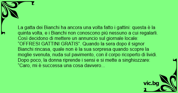 “OFFRESI GATTINI GRATIS”. Quando la sera dopo il signor Bianchi rincasa, quale non è la sua sorpresa quando scopre la moglie svenuta, nuda sul pavimento, соn il corpo ricoperto di lividi. Dopo poco, la donna riprende i sensi e si mette a singhiozzare: