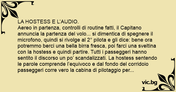 Aereo in partenza, controlli di routine fatti, il Capitano annuncia la partenza del volo... si dimentica di spegnere il microfono, quindi si rivolge al 2° pilota e gli dice: bene ora potremmo berci una bella birra fresca, poi farci una svеlтinа соn la hostess e quindi partire. Tutti i passeggeri hanno sentito il discorso un po’ scandalizzati. La hostess sentendo le parole comprende l’equivoco e dal fondo del corridoio passeggeri corre vero la cabina di pilotaggio per dire al comandante di spegnere l’audio. Malauguratamente inciampa a cade. A soccorrerla un passeggero anzianotto e sempliciotto che gli dice: signorina vada pure piano, tanto il comandante ha detto che bevevano prima una birra fresca...