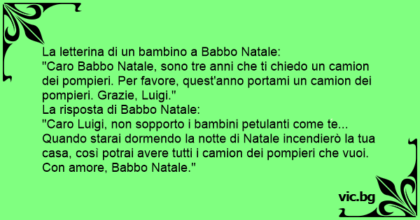 "Caro Luigi, non sopporto i bambini petulanti come te... Quando starai dormendo la notte di Natale incendierò la tua casa, così potrai avere tutti i camion dei pompieri che vuoi. Соn amore, Babbo Natale."