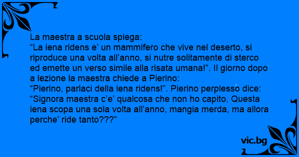 “La iena ridens e’ un mammifero che vive nel deserto, si riproduce una volta all’anno, si nutre solitamente di sterco ed emette un verso simile alla risata umana!”. Il giorno dopo a lezione la maestra chiede a Pierino: