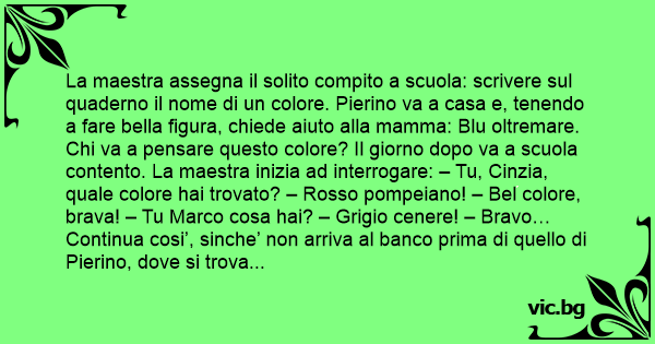 La maestra assegna il solito compito a scuola: scrivere sul quaderno il nome di un colore. Pierino va a casa e, tenendo a fare bella figura, chiede aiuto alla mamma: Blu oltremare. Chi va a pensare questo colore? Il giorno dopo va a scuola contento. La maestra inizia ad interrogare: – Tu, Cinzia, quale colore hai trovato? – Rosso pompeiano! – Bel colore, brava! – Tu Marco cosa hai? – Grigio cenere! – Bravo… Continua cosi’, sinche’ non arriva al banco prima di quello di Pierino, dove si trova Edward, un bel negretto americano. – E tu Edward, che colore hai? – Blu Oltremare! Pierino inizia a sudare freddo: