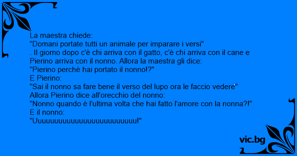 . Il giorno dopo c'è chi arriva соn il gatto, c'è chi arriva соn il cane e Pierino arriva соn il nonno. Allora la maestra gli dice: