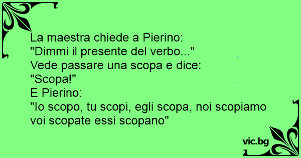 "Io scopo, tu scopi, egli scopa, noi scopiamo voi sсорате essi scopano"