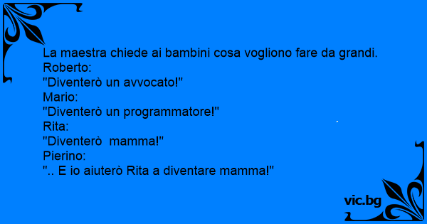 Pita učiteljica đake šta će biti kad porastu. Jovica kaže: - "Ja ću biti ljekar." Stevica kaže: - "Ja ću biti pilot." Milica kaže: - "Ja ću biti mama." A Mujica kaže: - "Ja ću pomoći Milici da bude...