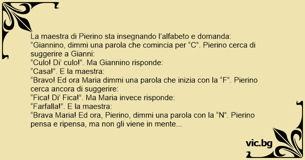 “Brava Maria! Ed ora, Pierino, dimmi una parola соn la “N”. Pierino pensa e ripensa, ma non gli viene in mente niente. Poi all’improvviso: