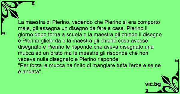La maestra di Pierino, vedendo che Pierino si era comporto male, gli assegna un disegno da fare a casa. Pierino il giorno dopo torna a scuola e la maestra gli chiede il disegno e Pierino glielo da e la maestra gli chiede cosa avesse disegnato e Pierino le risponde che aveva disegnato una mucca ed un prato ma la maestra gli risponde che non vedeva nulla disegnato e Pierino risponde: