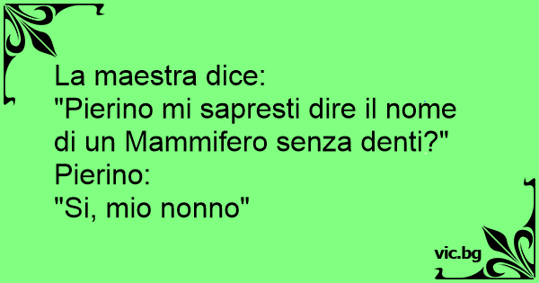 La maestra sta facendo lezione di scienze. Mentre sta spiegando i mammiferi fa delle domande agli studenti: “Pierino, sapresti farmi un esempio di un mammifero senza denti?”. “Si’… mia nonna!”